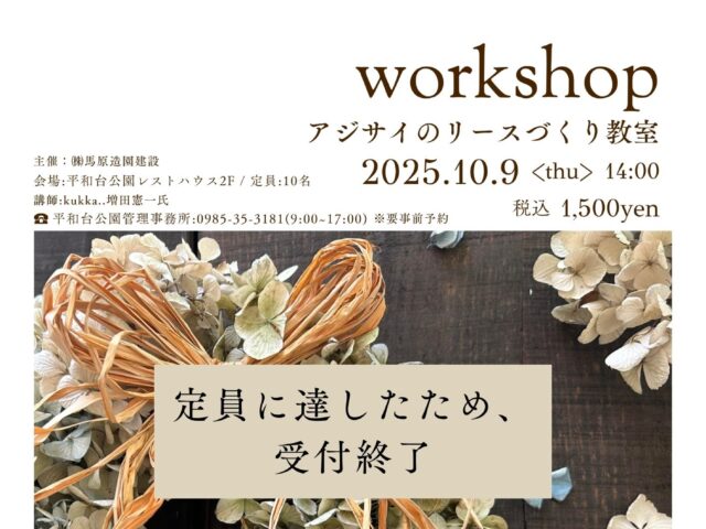 10月9日(木)に開催予定の「アジサイのリースづくり教室」につきまして、定員に達…