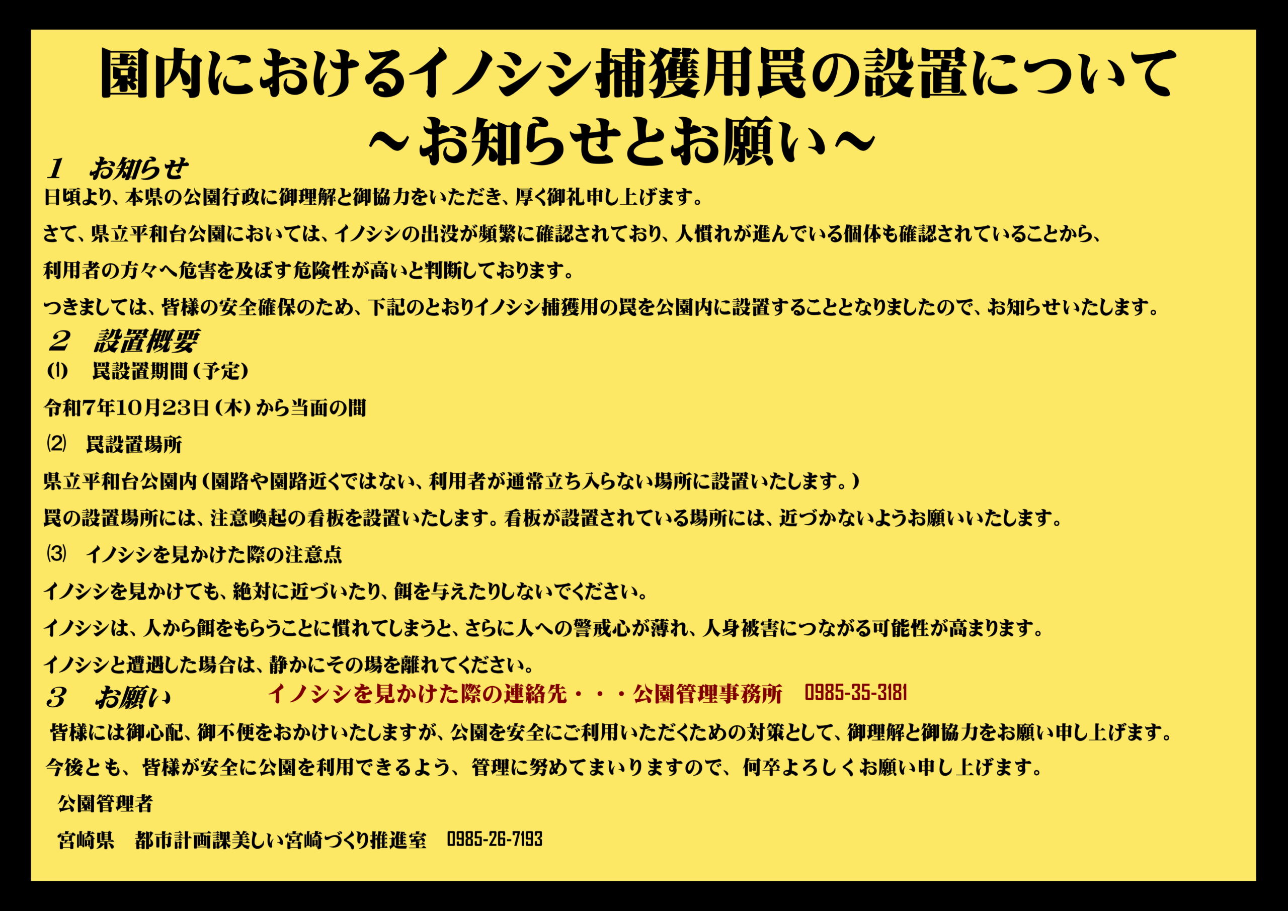 園内におけるイノシシ捕獲用罠の設置について(お知らせとお願い)