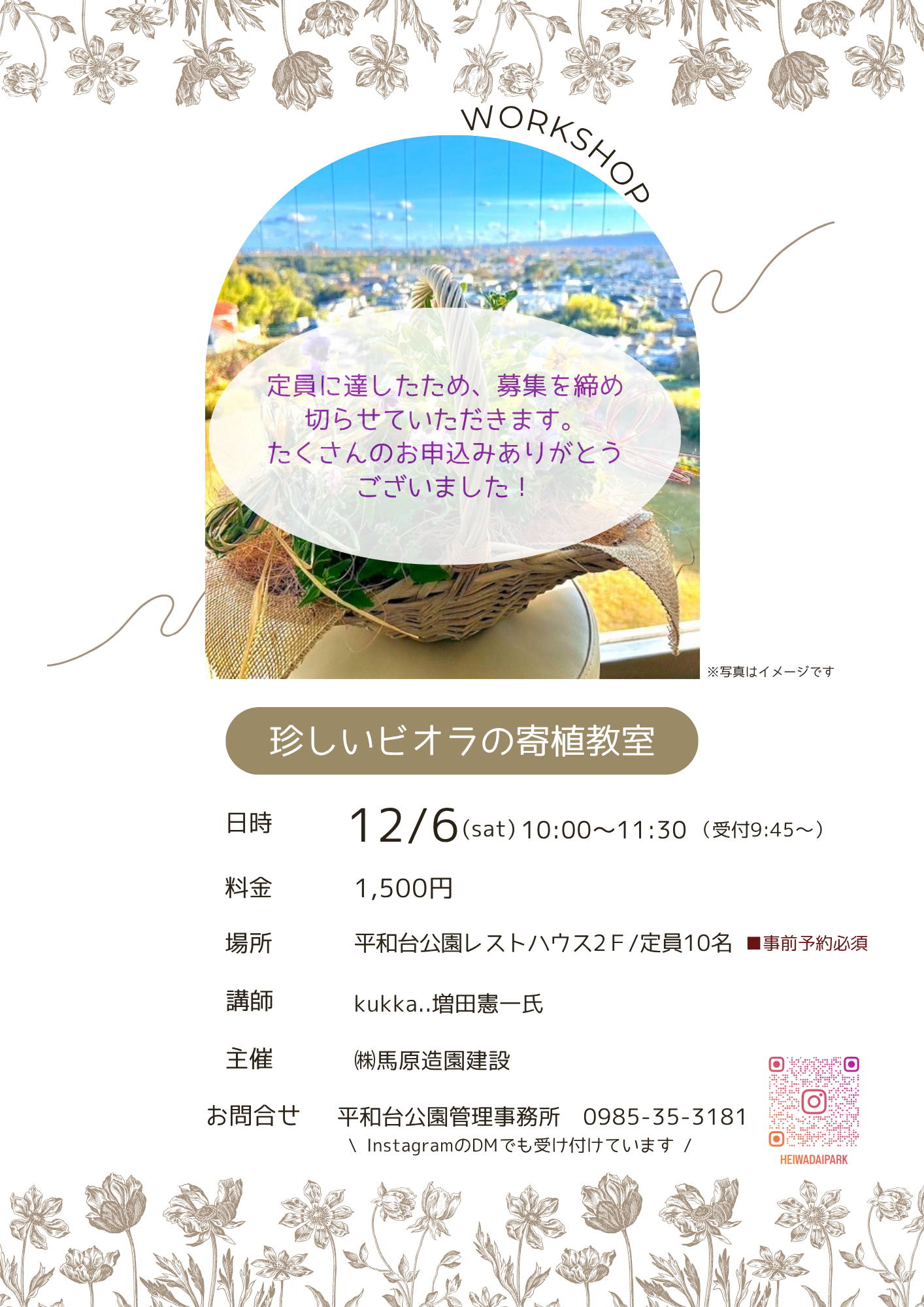 12月6日(土)に開催予定の「珍しいビオラの寄植教室」につきまして、定員に達しましたので、受付を終了いたしました。