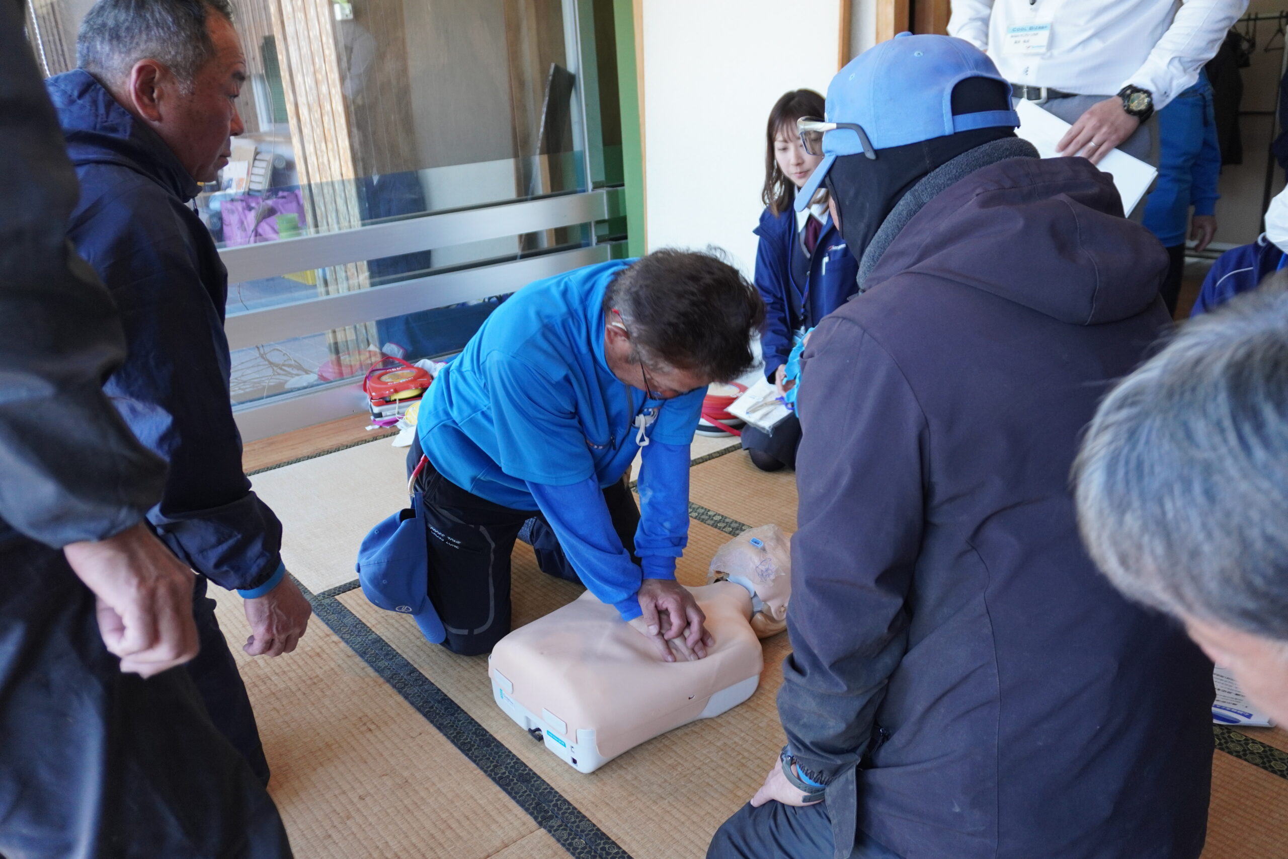 ▼手順の説明後、公園スタッフが人形を使って胸骨圧迫(心臓マッサージ)などの実技訓練も行いました。