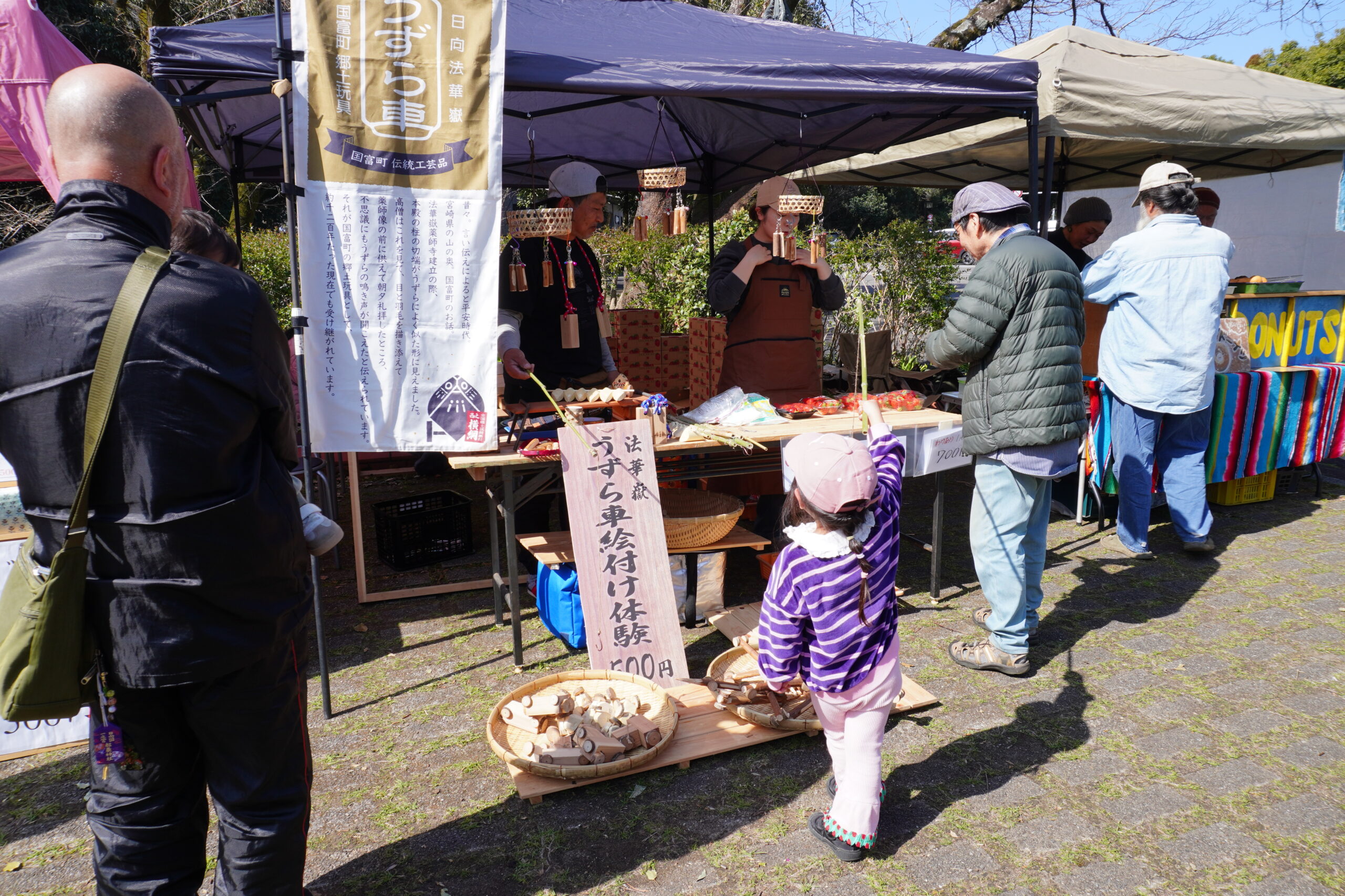 天然酵母のパンや揚げたてドーナツ、淹れたてのコーヒー、さまざまなドリンク、美腸カレー、ハンドメイドアクセサリーなどの販売ブースのほか、うずら車の絵付け体験などの体験ブースもあり、来園者は思い思いに会場内を見て回っていました。